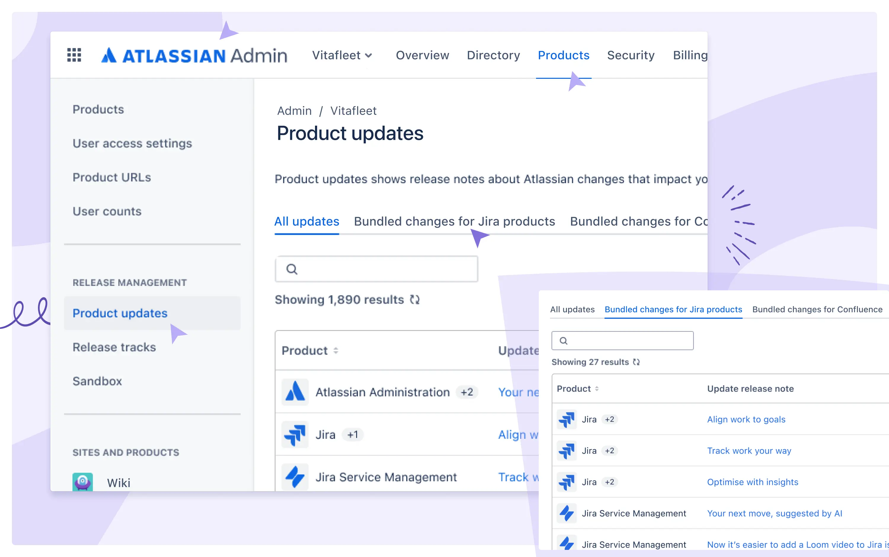 If you have products on the bundled track and continuous track, you can view information about all the changes in one place – no need to switch between Release tracks and Product updates. With the new table layout and the search and filter options, you’ll also be able to find what you’re looking for faster. How to manage product release tracks To view bundled changes for Jira products or Confluence: Go to admin.atlassian.com. Select your organization if you have more than one. Select Products > Product updates. Select Bundled changes for Jira products or Bundled changes for Confluence.